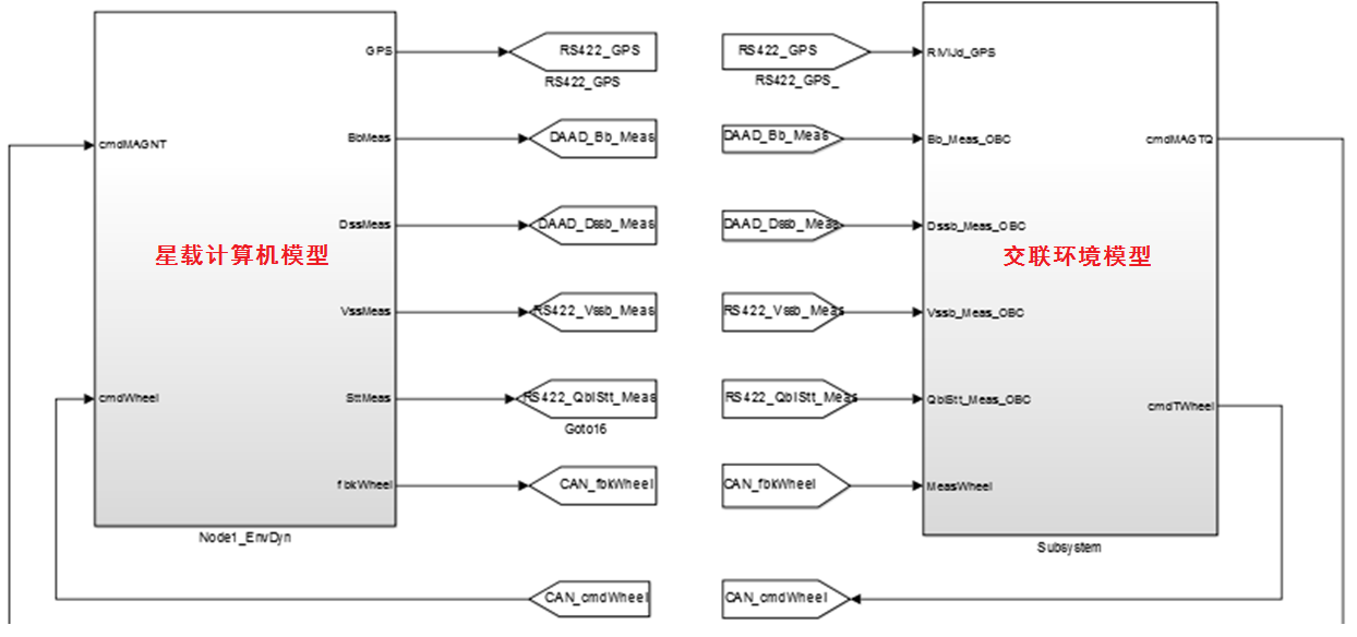 下图是卫星姿轨控半实物仿真的示例模型,星载计算机原型通过CAN总线与飞轮实物设备进行通信,发送速度指令并采集实际转速,同时通过RS422和AIO传递GPS、星敏、太阳敏等传感器数据。