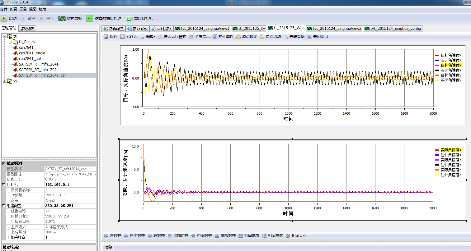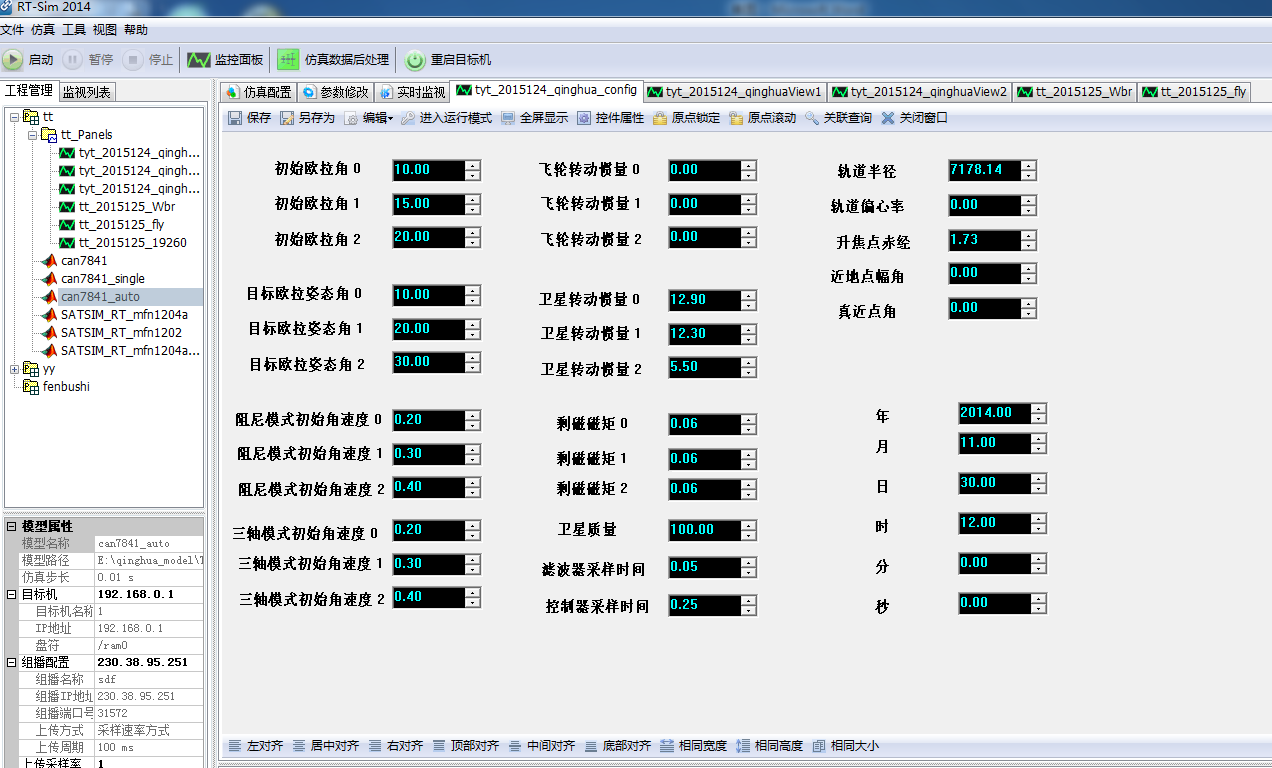 在半实物仿真验证过程中,通过RT-Sim软件可以对卫星姿轨控系统中的核心参数(如目标欧拉角、卫星转动惯量、阻尼模式初始速度等)进行在线设置,同时对变量数据(如估计角速度XYZ、实际角度速度XYZ)进行监视,如下图所示: