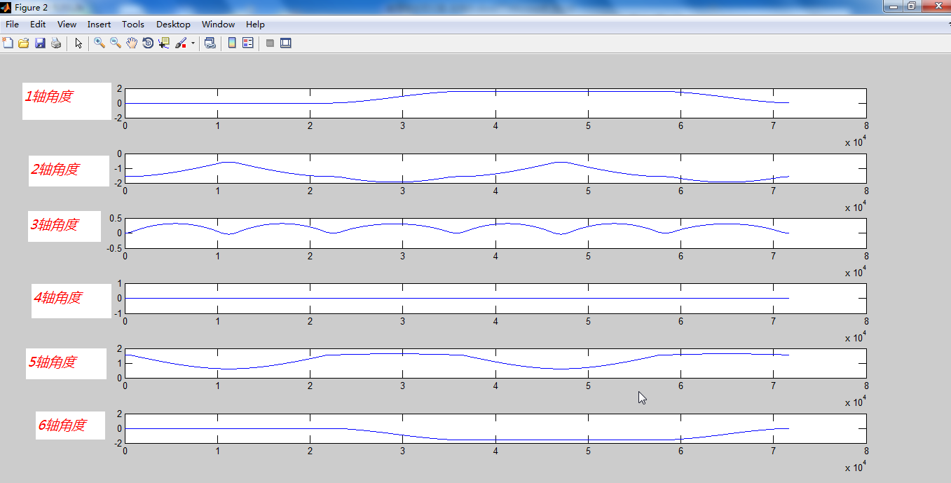 单击Profile按钮,执行轨迹规划操作,经过正逆解运算后,直接得到6个关节角度曲线。