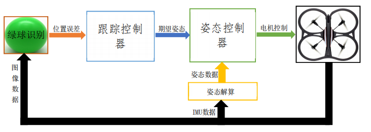 如下图所示,绿球跟踪控制系统采用分层控制思想,最上层为绿球跟踪控制器(BBB板载ARM处理器),最下层为无人机姿态控制器(BBB板载GPU处理器),上层的控制器输出作为下一层控制器的给定输入。