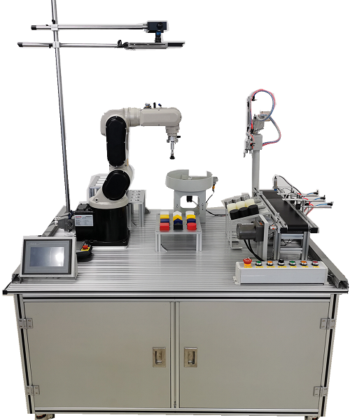 本设备以垂直串联六关节工业机器人为核心,将机器视觉、机器人运动控制、光机电综合等技术有机地进行整合,采用模块化结构,便于灵活组合,实现对不同物料进行快速的检测、抓取、搬运等操作。为了方便实验教学,系统进行了专门的设计,可以完成工业六自由度机器人运动控制和机器视觉检测。