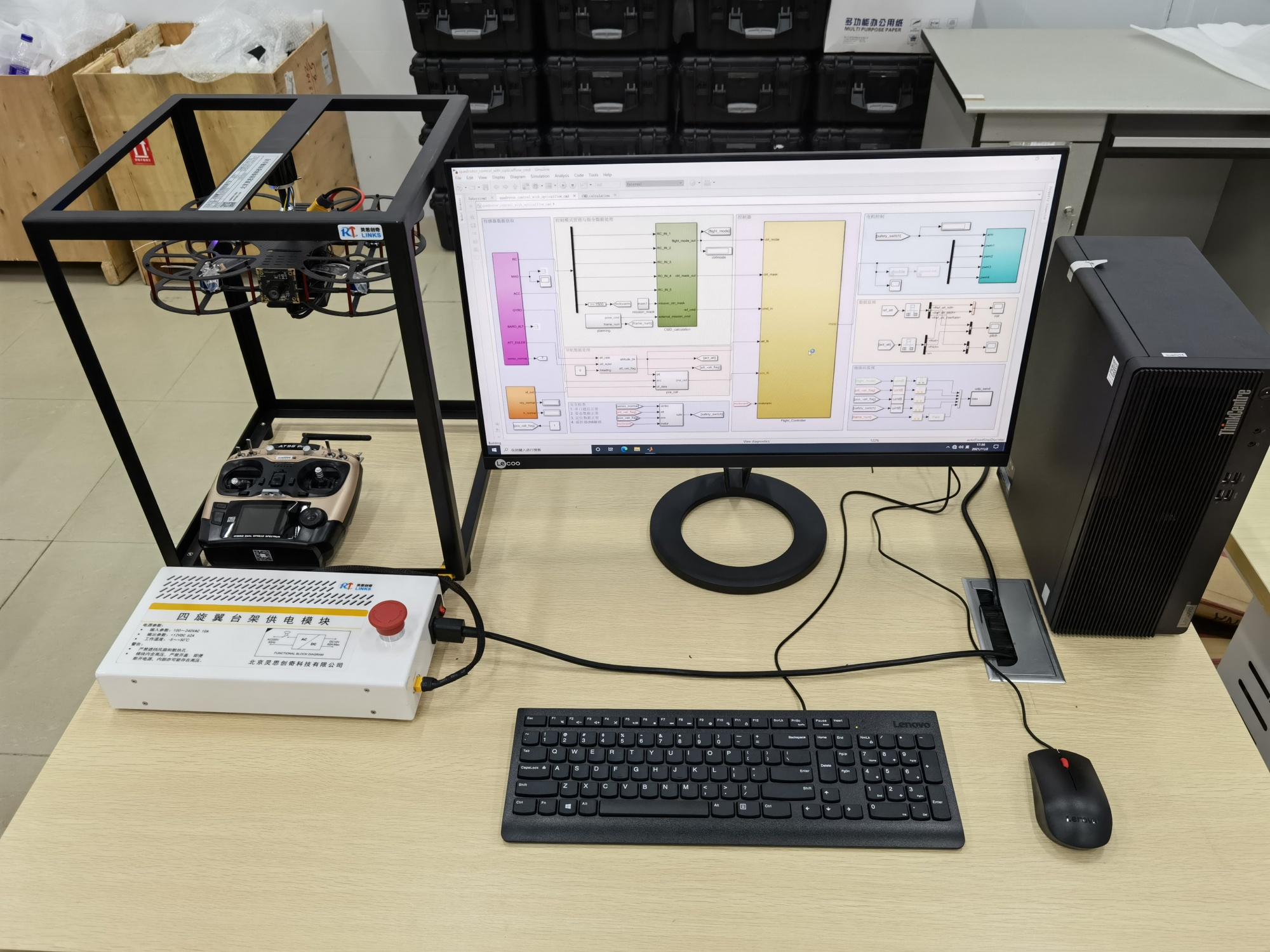 系统的硬件设备主要由开发主机、台架实验飞行器、飞行实验飞行器构成。本平台采用先进的基于模型的设计(MBD)开发思路,可支撑控制系统数学仿真、台架实验、实飞实验,具备模型编译、下载、数据监视记录、后处理等完成的工具软件,能够帮助学生熟悉整套控制系统设计流程。